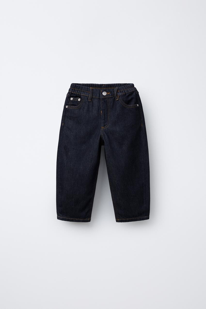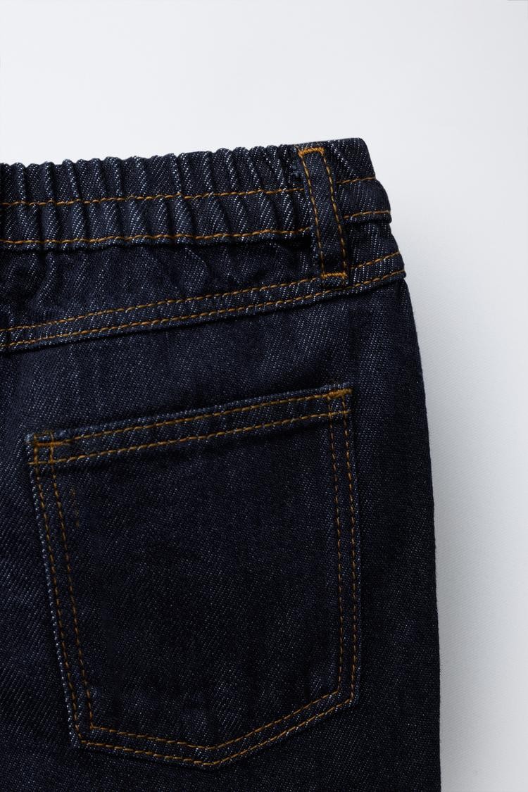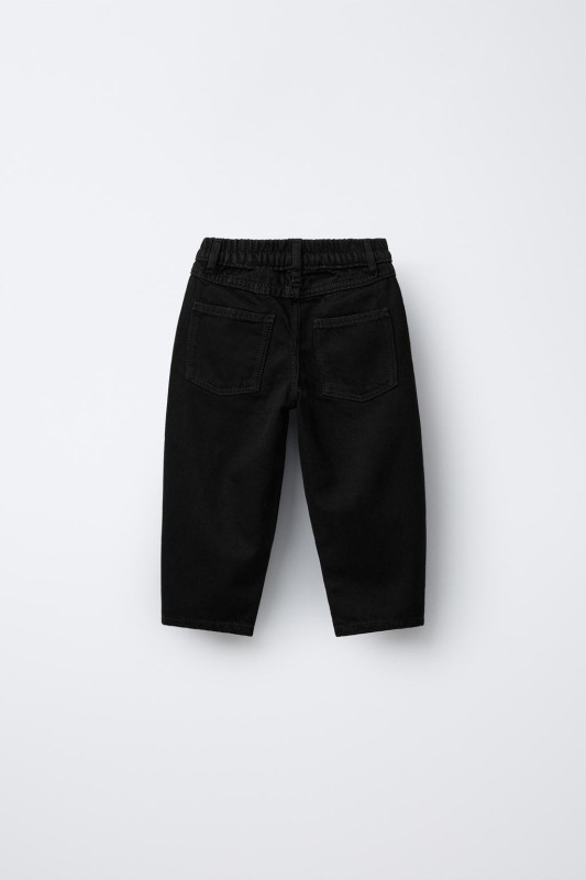 Denim trousers with an elasticated waistband and front snap-button fastening. Featuring front pockets and back patch pockets.