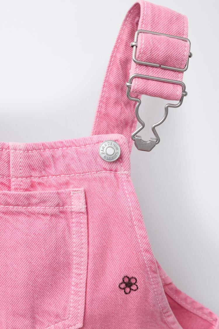 Dungarees featuring a straight neckline and adjustable straps with front buckle fastening. Snap-button fastening on the sides. Patch pocket on the chest. Embroidered floral detail.