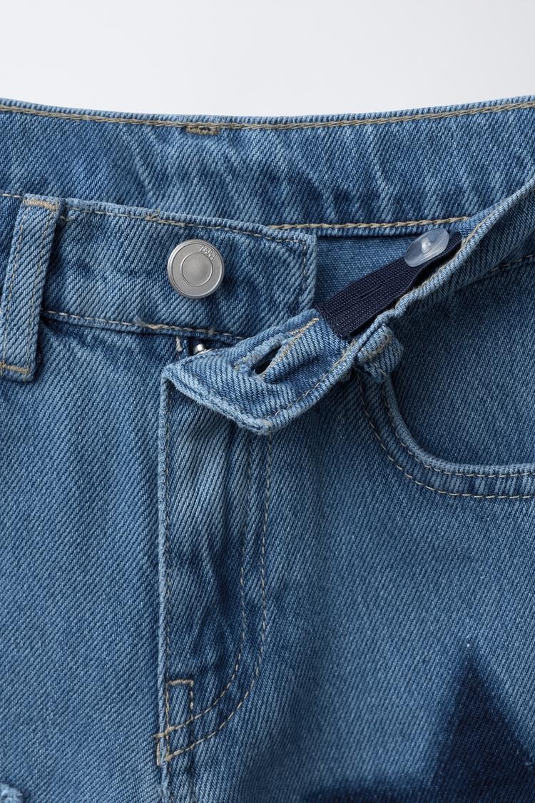 Wide-leg jeans with an adjustable inner waistband and a front button fastening. Featuring front pockets and patch pockets on the back. Star patch appliqué.