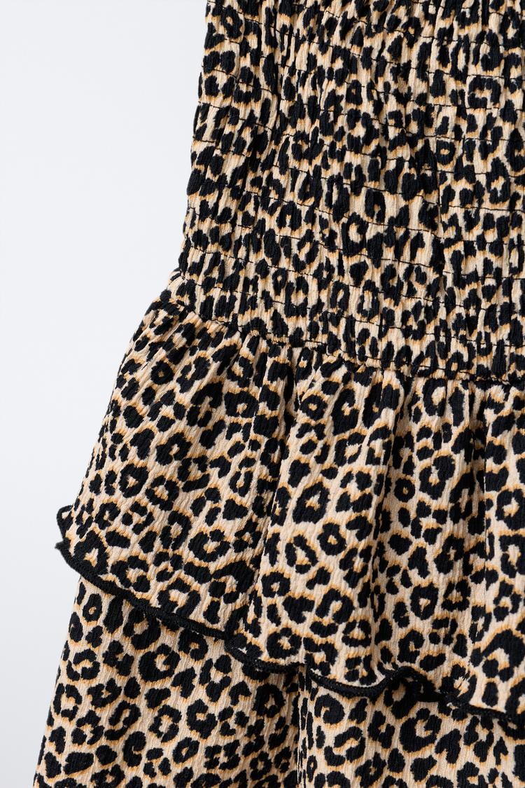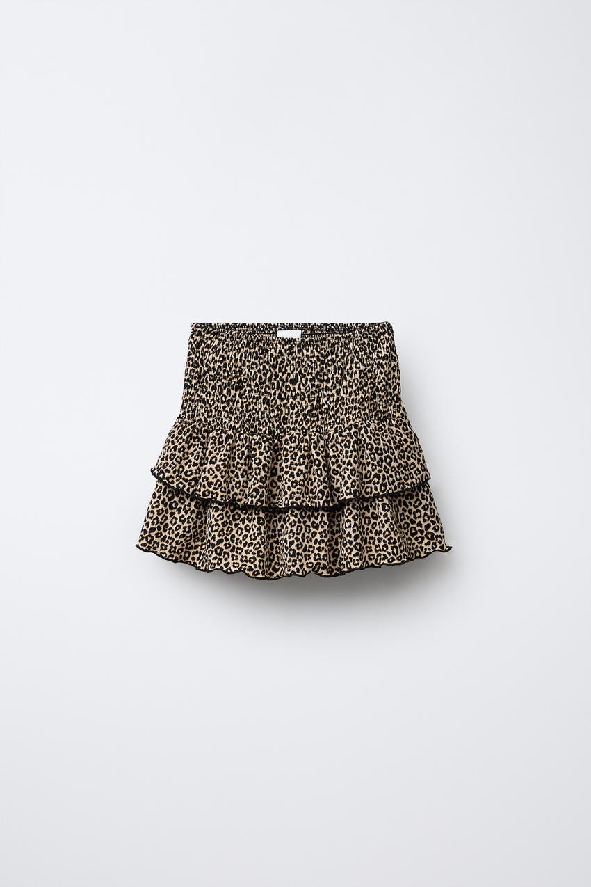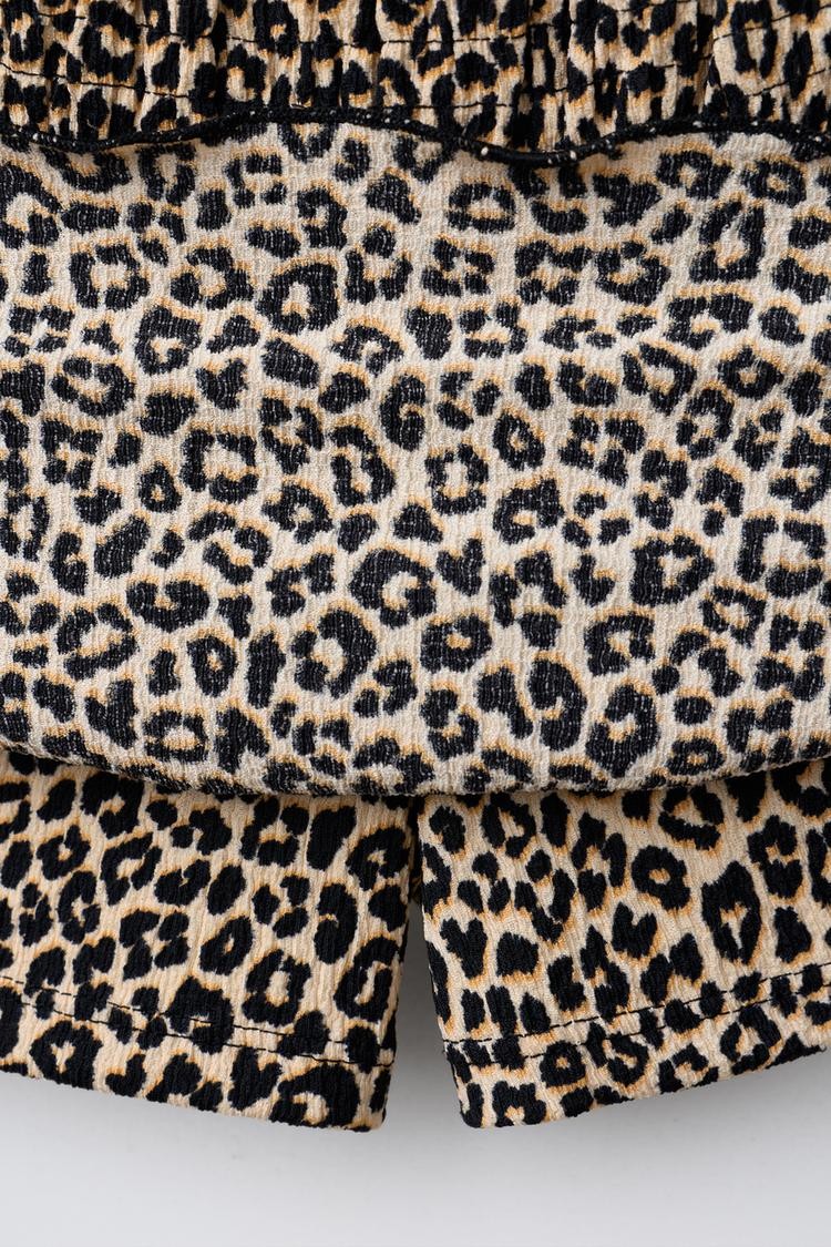 Bermuda skort with an elastic waistband. Featuring ruffle detail and an animal print.