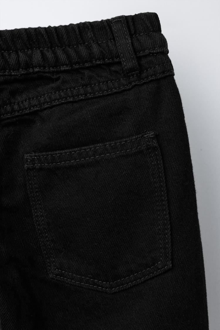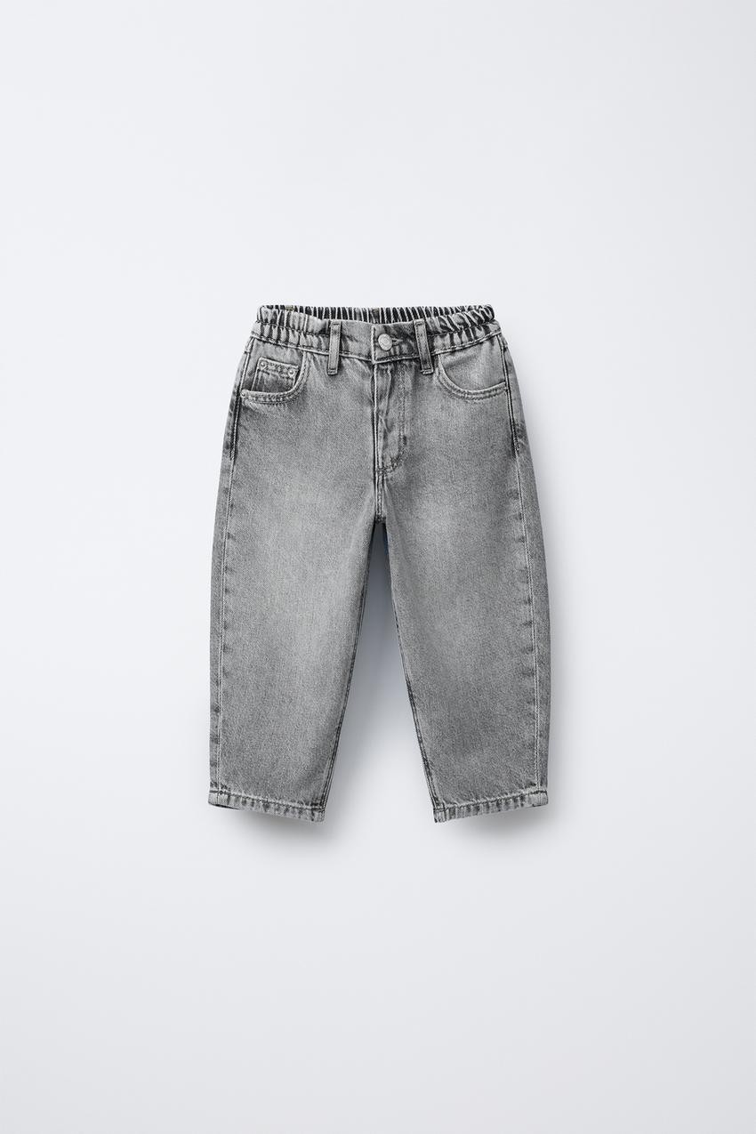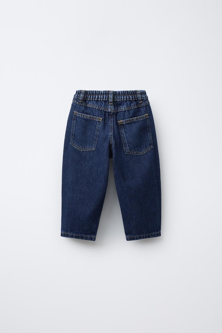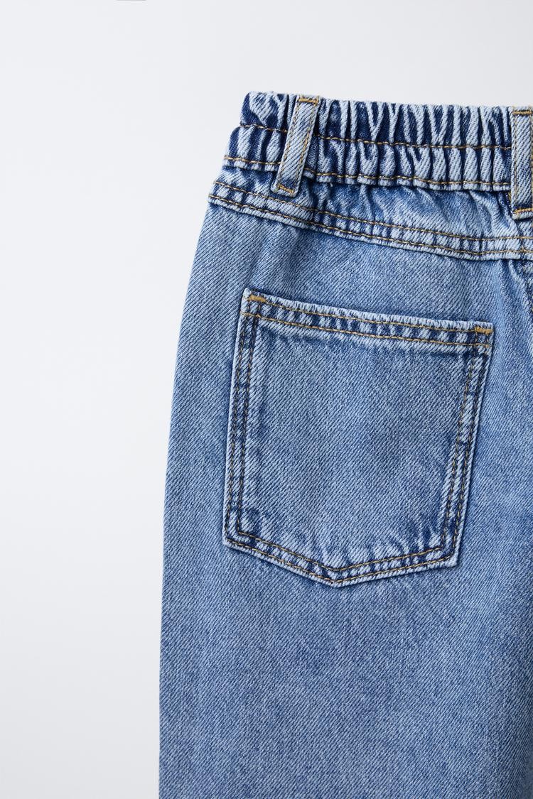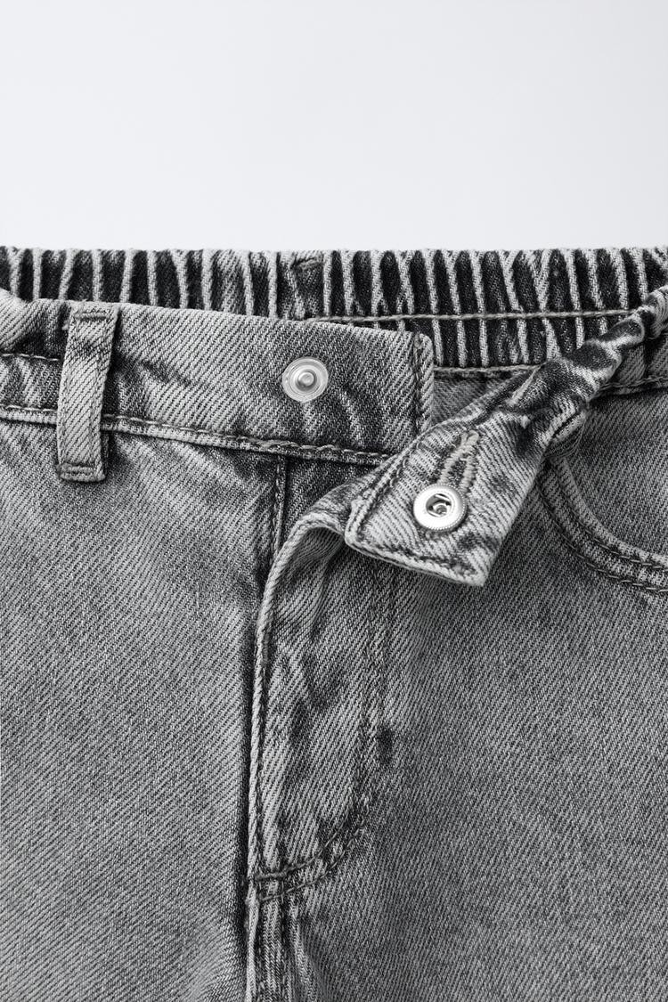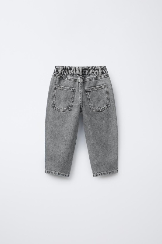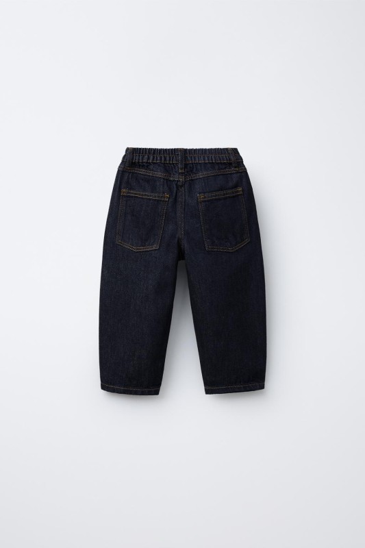 Denim trousers with an elasticated waistband and front snap-button fastening. Featuring front pockets and back patch pockets.