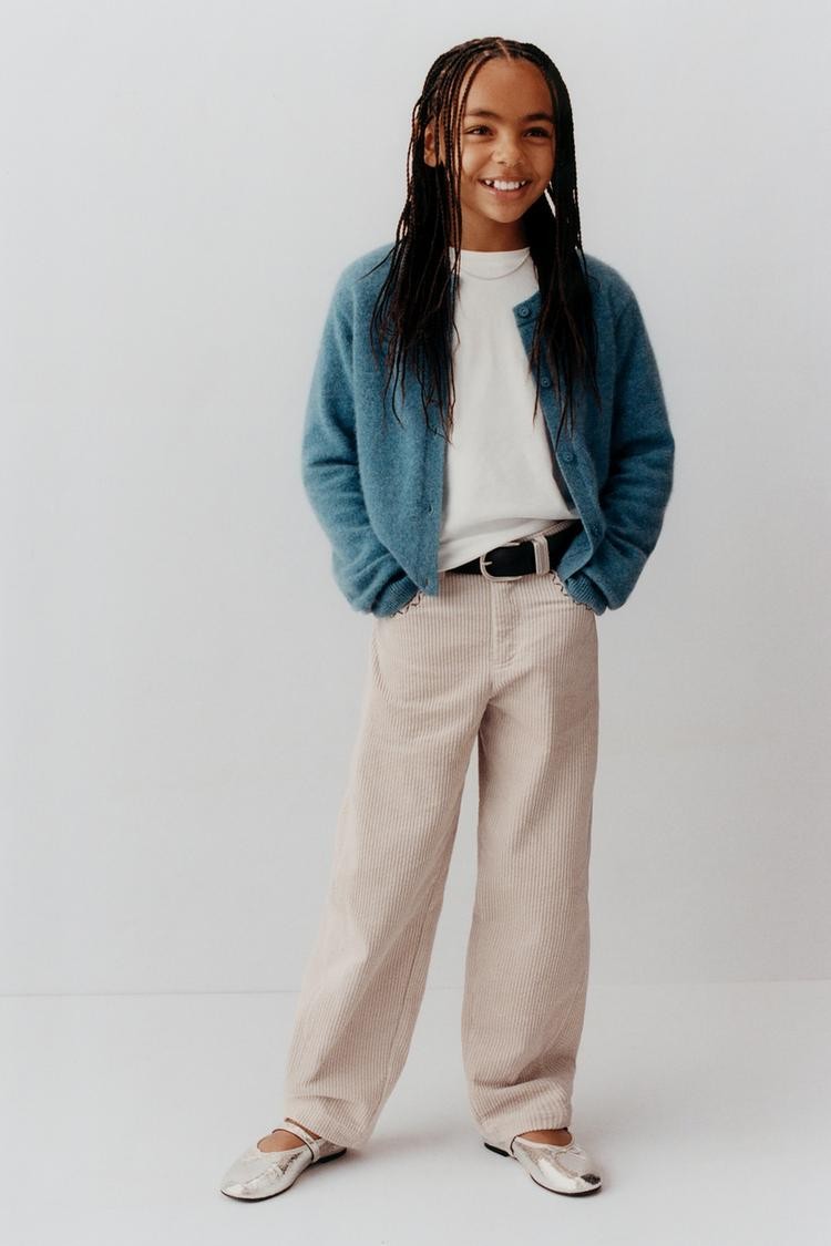 Barrel-style corduroy trousers with an adjustable inner waistband and front button fastening. Front pockets and patch pockets at the back. Embroidered details with contrast colour.