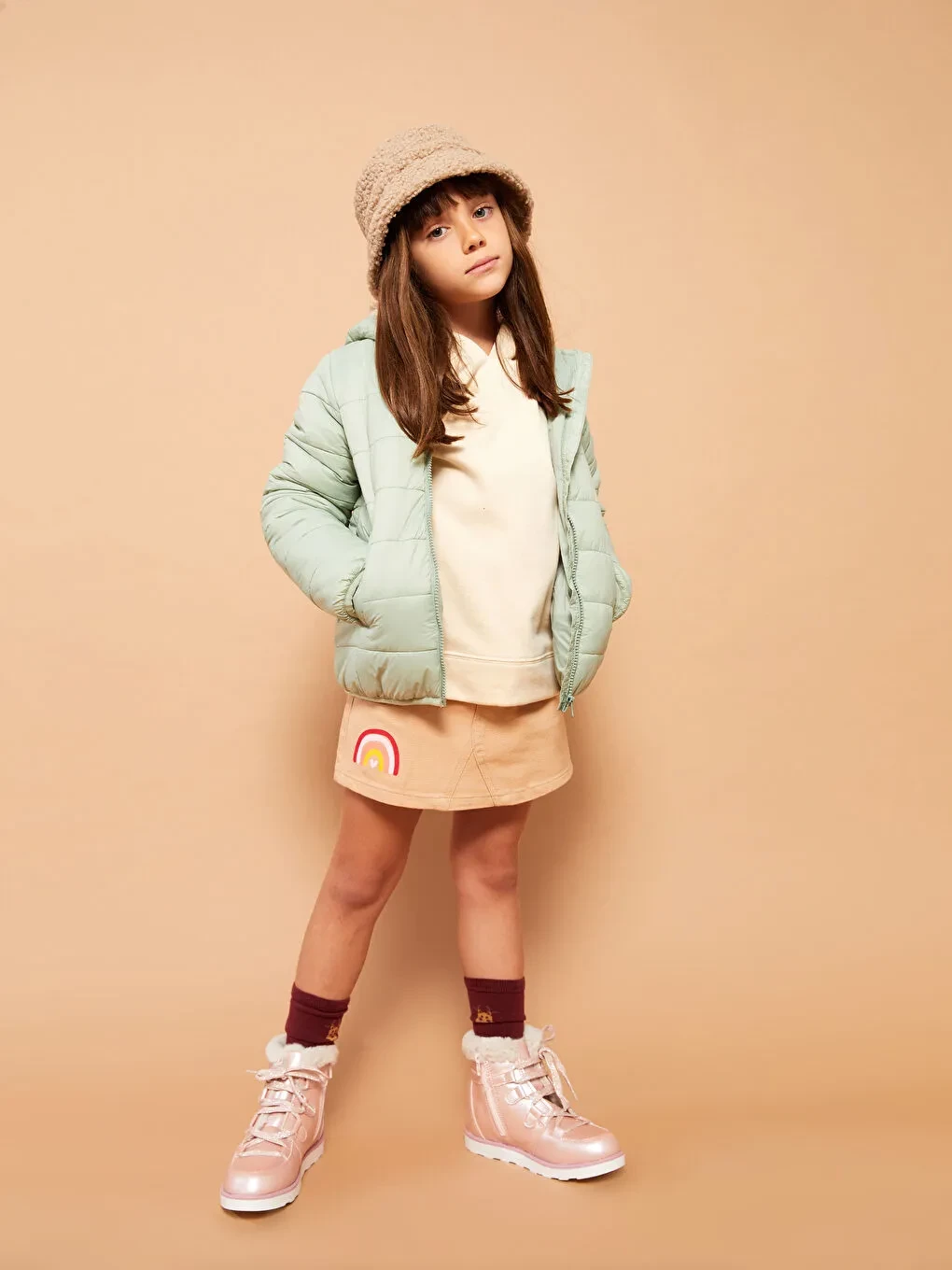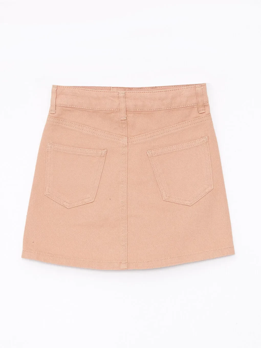 - Girls' skirt, made of 100% cotton fabric. It has five pockets, zipper and button closure. It has embroidery on the front hem.