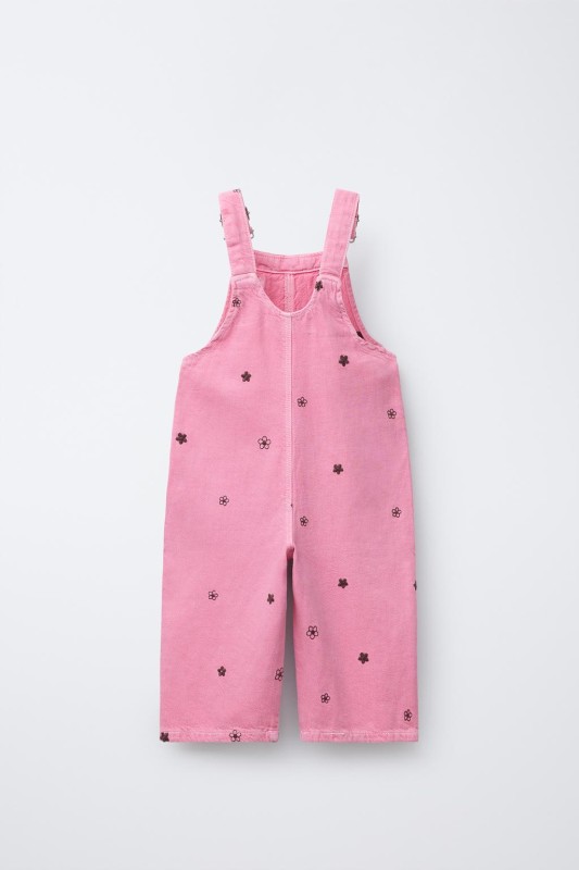Dungarees featuring a straight neckline and adjustable straps with front buckle fastening. Snap-button fastening on the sides. Patch pocket on the chest. Embroidered floral detail.