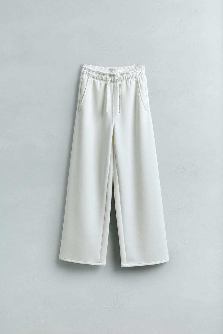 Wide-leg trousers with an elastic waistband and drawstring detail at the front. Front pockets. Fabric with 41% cotton.